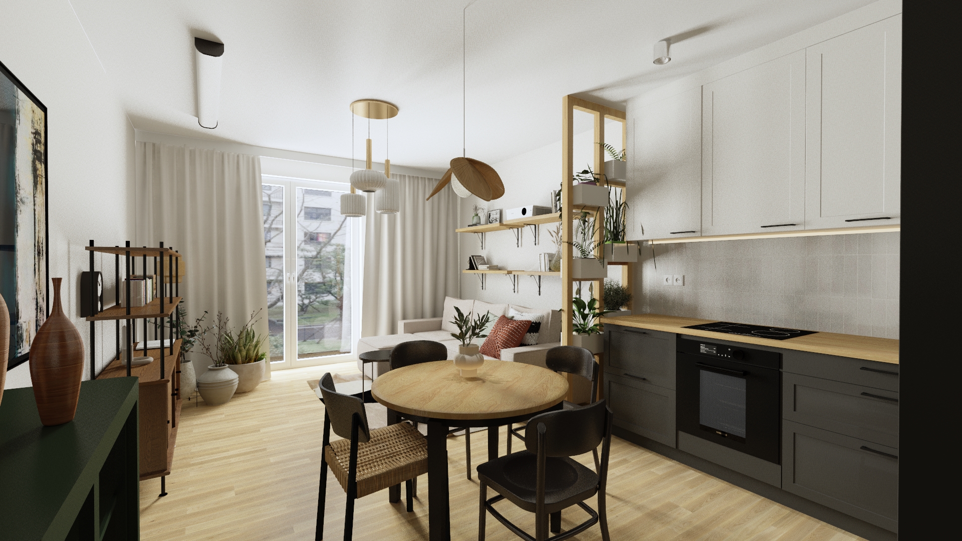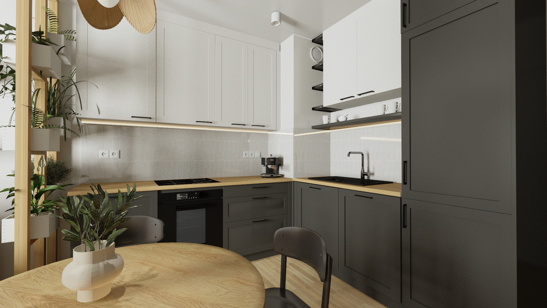 Ciekawy projekt salonu z kuchnią w mieszkaniu na Warszawskim Bemowe. Nowe budownictwo, młodzi inwestorzy. Postawili odważnie na ciemniejszą kuchnię, dużo roślin i naturalnych materiałów.