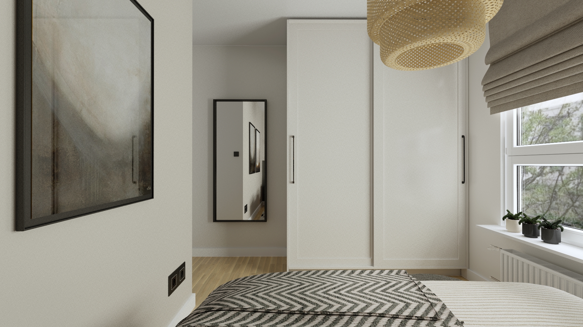 Sypialnia dla młodych inwestorów, niewielka ale ma wszystko czego potrzeba, wygodne łóżko, szafa, stoliki nocne.